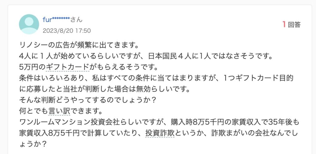 リノシー自体が悪いというより、不動産投資のリスクが高すぎるという印象でした。