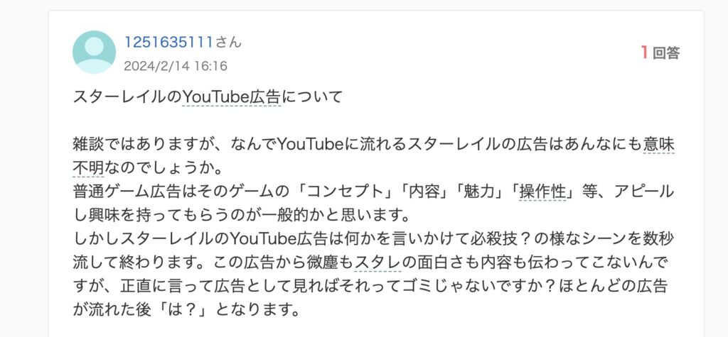 Yahoo知恵袋に「なんでYouTubeに流れるスターレイルの広告はあんなにも意味不明なのか」という質問が立っていました。